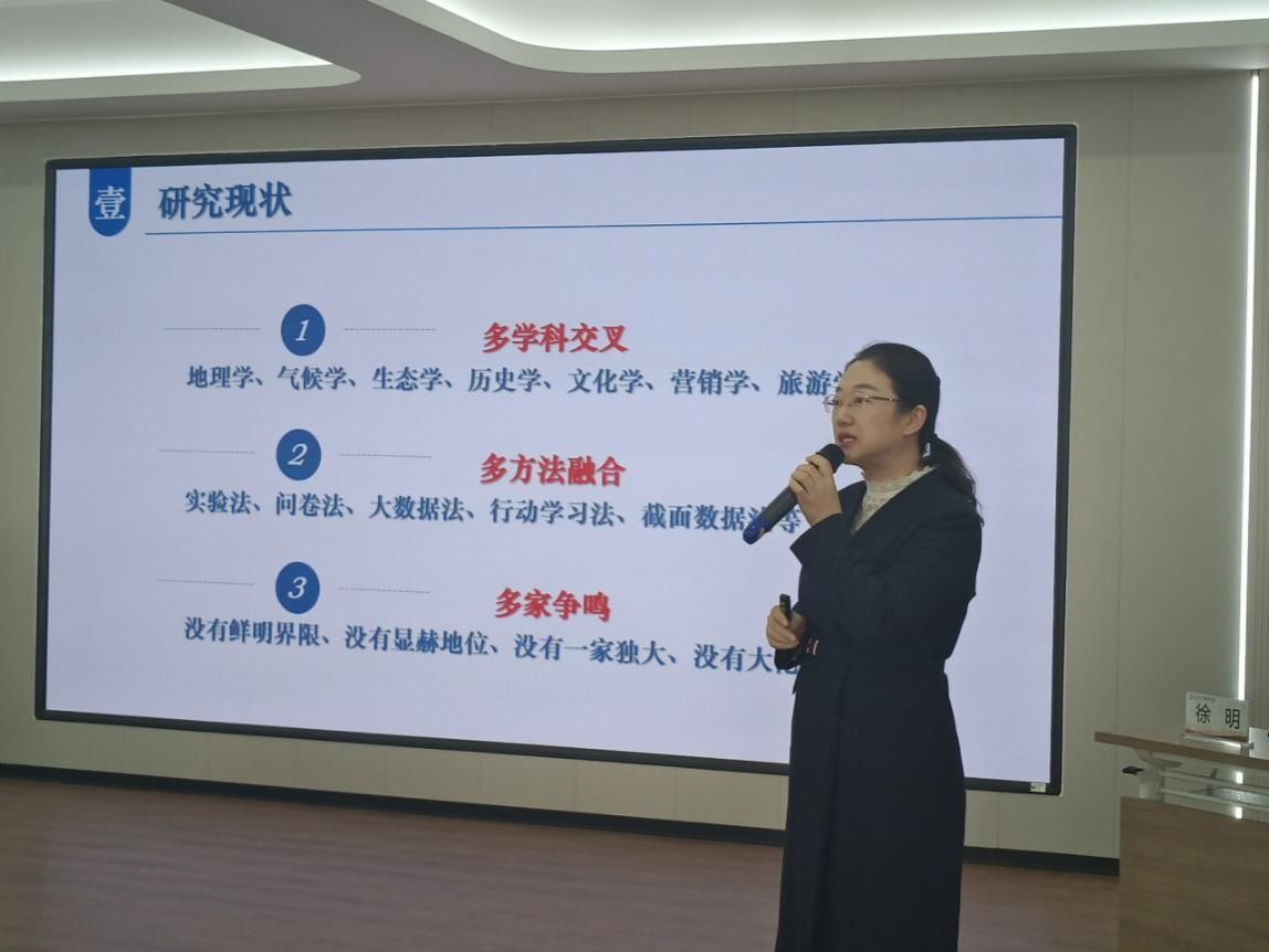 在讲座中,徐明围绕旅游学科的发展现状与趋势、旅游学科研究选题的方法路径和项目申报的技巧与指导进行了精彩讲解。首先,她重点分析了旅游领域多学科交叉特性带来的研究机遇,详细阐述了旅游学科研究的三大转向:从产业经济到“幸福产业+民生产业”双定位、数智化技术与传统研究相融合、文旅科融合与区域协同发展成新热点。随后,徐明结合自身申报国社科项目的丰富经验,系统分享了选题策略,强调选题时需深入挖掘项目立项指南,精准研读相关政策文件,主动观察旅游实践中的生活现象提炼科学问题,同时通过分析历届立项名单寻找研究的空白与机会;她还建议教师要持续深耕某一领域,多方征求同行专家意见,通过反复打磨,不断优化申报书质量。最后,徐明指出,教师应构建教学、科研与社会服务协同发展模式,通过深入社会服务挖掘真实科研问题,结合教学反思凝练创新研究课题,再将科研成果有效反哺至教学实践,形成良性循环,并鼓励教师坚持深耕、认真申报,坚信努力终会获得回报。