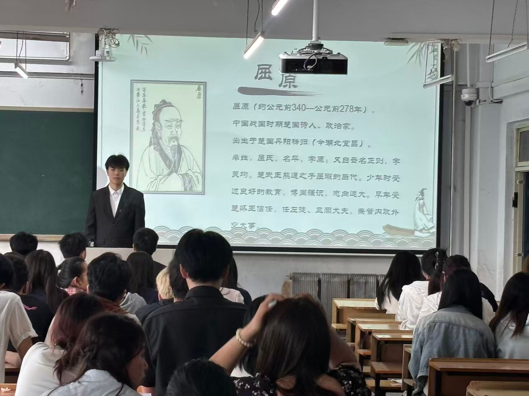 活动初始,同学们先围绕主题,展开热烈讨论。结合自己日常学习和知识积累,分享了自己对屈原生平了解。他把个人命运与国家兴衰紧紧绑定,这份纯粹的爱国热忱,跨越千年仍振聋发聩。了解他的生平,让我们明白“爱国”不是空洞口号,而是像他一样,为热爱的土地和人民,拼尽全力坚守、付出。