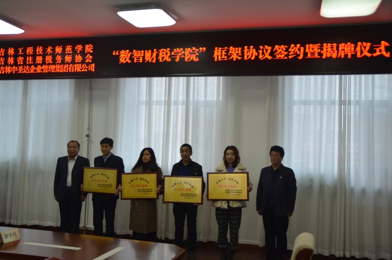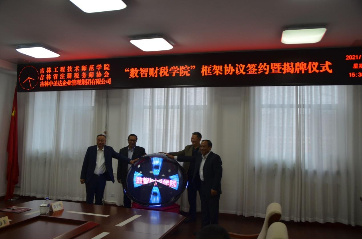 11月4日下午三时,吉林工程技术师范学院、吉林省注册税务师协会、吉林中圣达企业管理集团有限公司合作共建“数智财税学院”框架协议签约暨揭牌仪式在学校凯旋校区办公楼410会议室成功举行。校长杨晓东,党委副书记陈景翊,吉林省注册税务师协会会长徐永义、副会长李春安,吉林中圣达企业管理集团有限公司董事长王晓刚,吉林省中翰圣达等多家税务师事务所所长,以及学校人事处、创业就业处、工商管理学院党政领导和教师代表等人员出席仪式。仪式由学校党委常委、教务处处长张存贵主持。