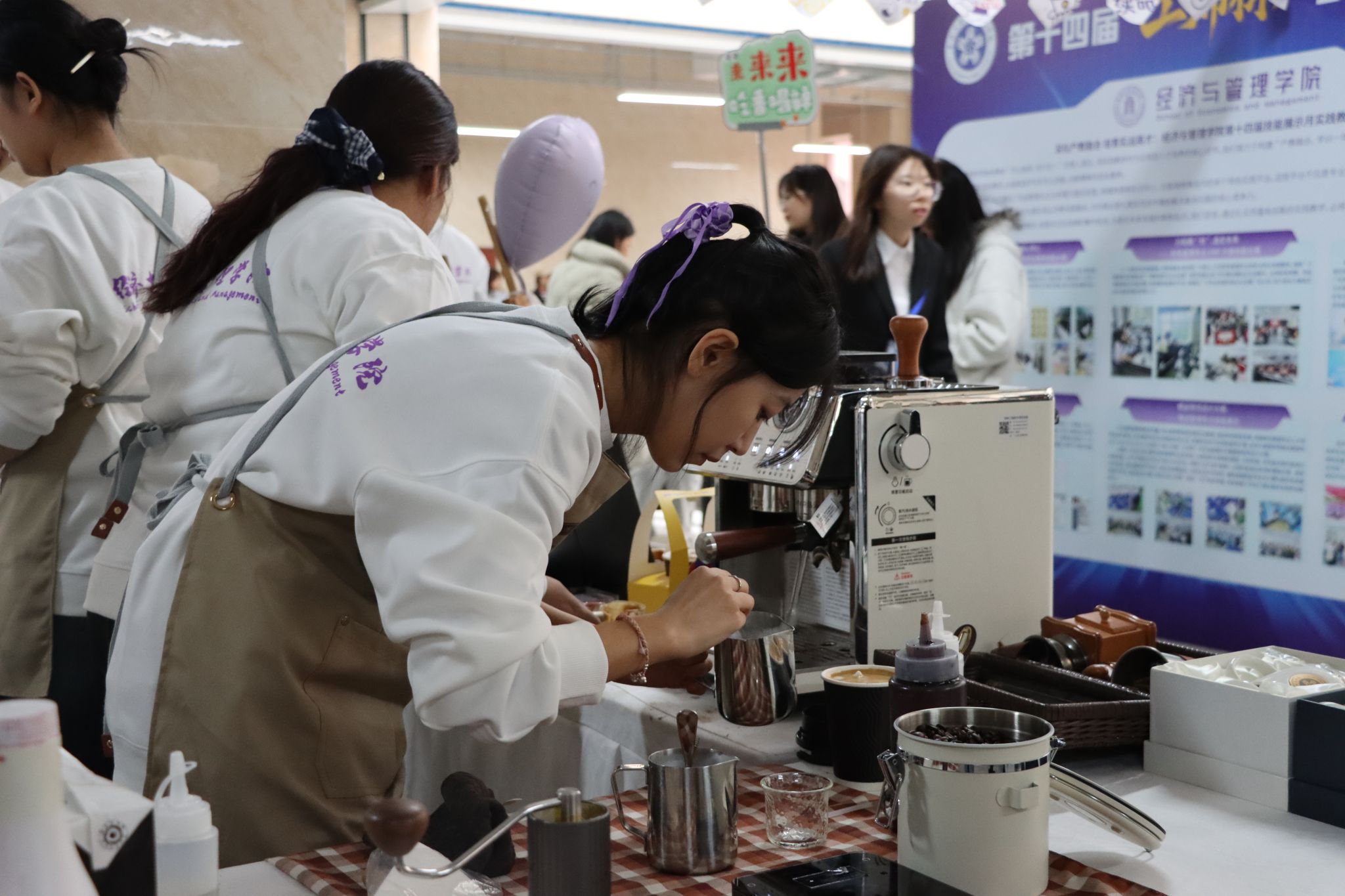 创客咖啡协会:在10月29日的创业市集活动中,我院创客咖啡协会的表现为整个技能月活动画上了浓墨重彩的一笔。协会成员进行了实体咖啡售卖,从原料采购、产品制作、成本核算到现场销售与服务,完整模拟了小微企业运营流程。尤为可喜的是,通过团队成员的努力,创客咖啡摊位实现了1700元的营业额,这不仅是一组可喜的销售数据,更是对学生创新创业精神、市场洞察力、团队协作与经营管理能力的直接肯定与有效激励,是实践教学成果最生动的体现。