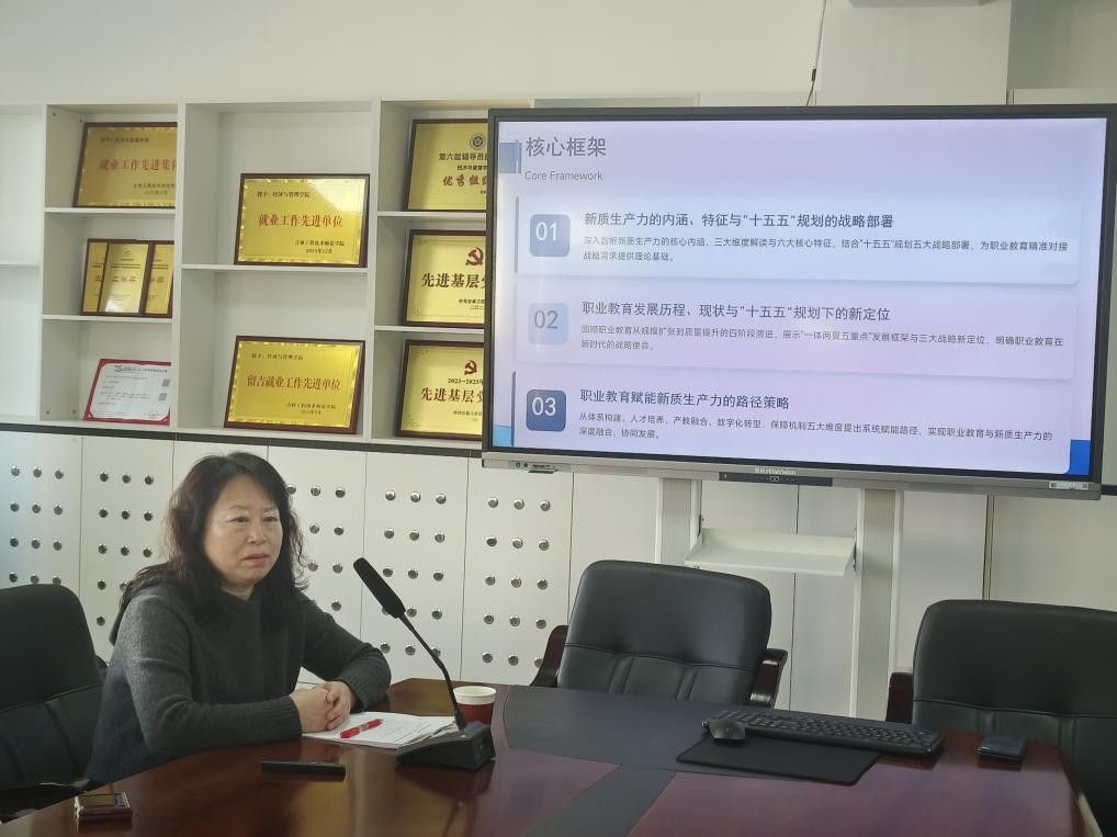 随后,孙艳波老师以清晰的逻辑框架展开讲解。她从新质生产力的提出背景与战略意义切入,深入剖析其“科技创新驱动、质态质效双升、人才支撑核心”的三维内涵,详细解读了技术迭代突破性、产业体系融合性等六大核心特征。结合“十五五”规划五大战略部署,她系统梳理了职业教育从规模扩张到质量提升的四阶段发展历程,重点介绍了“一体两翼五重点”发展框架的实践成效,以长春市汽车产业集群产教联合体为例,展示了产教融合从“物理融合”到“化学融合”的转型经验。